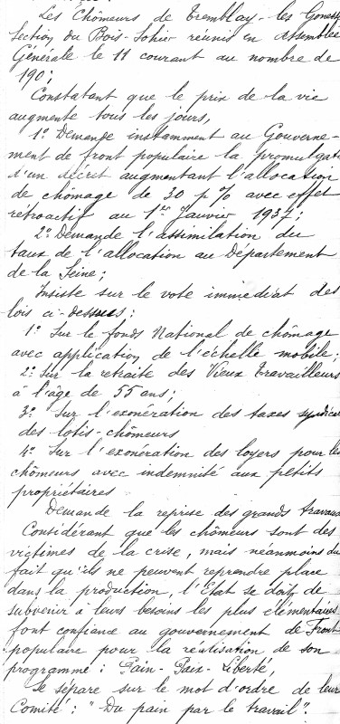 Cahier de revendications des chômeurs de Tremblay-lès-Gonesse, section du Bois-Sohier, réunis en assemblée générale, le 11 février 1937, au nombre de 190. Cliché SEHT