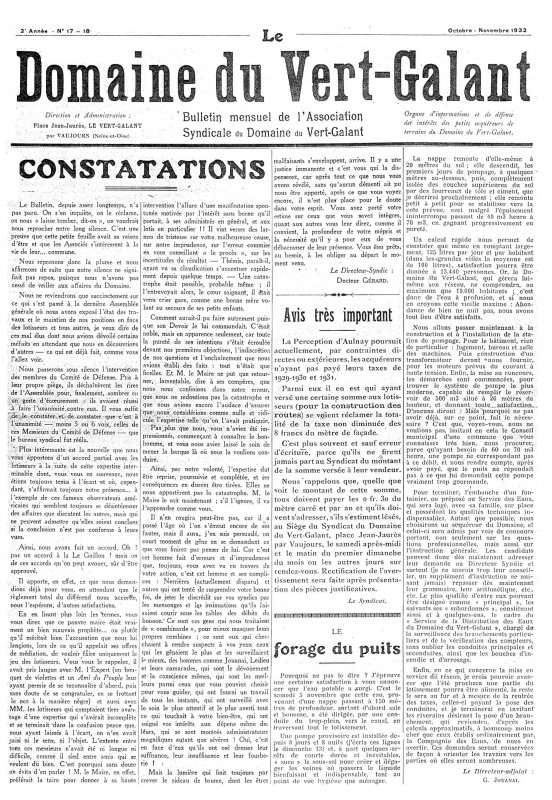 Page une du bulletin de l’association syndicale autorisée du Domaine du Vert-galant, n° 17-18, 1932