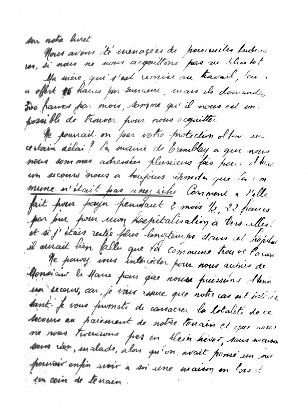 J’ai aussi une demande à vous faire. Nous sommes venues il y a cinq ans au Tremblay, acheter un terrain par tempérament dans une société. Or, nous n’avons pu, une personne sur quatre travaillant, payer régulièrement les mensualités, si bien qu’un assez fort arrérage, près de 4 000 francs je crois, est encore dû sur notre livret.(...)