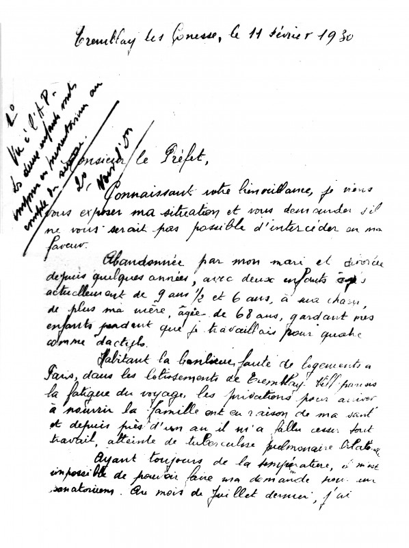 Afin de mettre en évidence la situation dramatique des familles de lotis, lorsqu’elles sont frappées par la maladie, nous citerons une lettre écrite au préfet de Seine-et-Oise, le 11 février 1930, par une Tremblaysienne domiciliée rue de Rouen. Abandonnée par son mari, elle a alors en charge deux enfants de 6 et 9 ans et une vieille maman de 68 ans, qui garde les enfants pendant que sa fille travaille à Paris, en qualité de dactylographe.