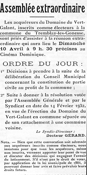 Le projet de sécession n’est pas seulement soutenu de quelques aventuristes non représentatifs, il est porté par une large majorité des habitants du quartier, au sein de l’association syndicale. N’est-il pas exprimé par les Assemblées générales qui mandatent le bureau pour aller dans cette direction ? L’ordre du jour de l’Assemblée générale extraordinaire du 10 avril 1932, convoquée pour 9 h 30 au cinéma du Vert-Galant comporte la question en point n° 2
