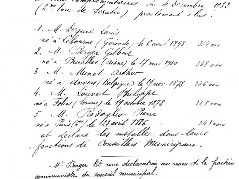 Délibérations du Conseil Municipal de Tremblay-lès- Gonesse, séance du 12 décembre 1932: proclamation des résultats de l’élection partielle du 4 décembre 1932.