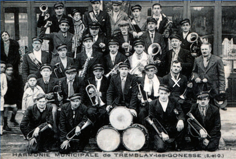 L’un des musiciens a le poing levé et parmi eux, au deuxième rang, on reconnaît Louis Dequet, repérable par une croix. CPA, collection SEHT.