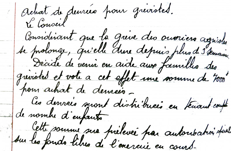 « Le Conseil, considérant que la grève des ouvriers agricoles, se prolonge, qu’elle dure depuis plus de trois semaines Décide de venir en aide aux familles des grévistes et vote à cet effet une somme de 7 000 francs pour achat de denrées.