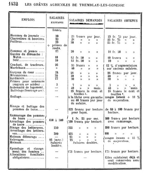 Tableau de l’accord salarial du 15 juin 1936 Pierre Fromont et Francis Bourgeois LES GRÈVES AGRICOLES DE TREMBLAY-LES-GONESSE EN 1936 Revue d’économie politique Dalloz Volume 51, No 5- 1937, page 1432.