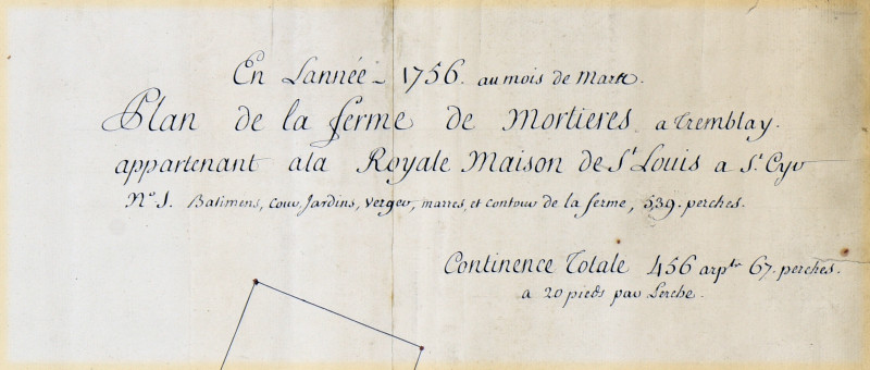 Titre du plan de la ferme de Mortières appartenant aux Dames de Saint-Cyr, 1756