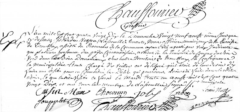 L’an mille sept cent quatre-vingt dix, le dimanche vingt neuf août, issue des vêpres, l’assemblée tenante, nous officiers municipaux de la Paroisse de Tremblay, assistés du Procureur de la Commune, ayant été avertis par voix indirectes, que plusieurs personnes des pays circonvoisins avaient eu la témérité de couper du Bois vert dans les Bois Domaniaux sur notyre territoire de Tremblay, en conséquence la municipalité étant chargée d’y veiller ont délibéré qu’il était de leur devoir d’y faire une visite pour en connaître les Délits qui pourraient avoir été faits dans les dits Bois, et que la dite visite se ferait le mari 31 août mille sept cent quatre-vingt dix et ont tous les membres de l’assemblée municipale signé.