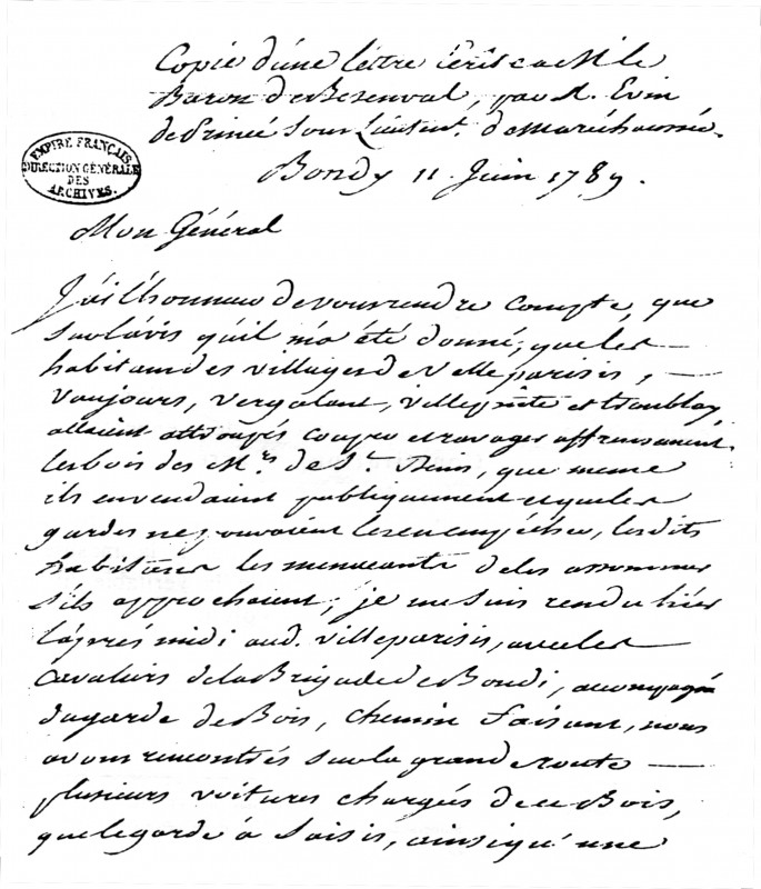 Lettre écrite le 12 juin 1789 par le sous-lieutenant Evin de Princé au baron de Busenval. L’officier informe son supérieur des troubles survenus dans les bois de Tremblay appartenant aux Religieux de Saint-Denis, Archives Nationales H 1453.