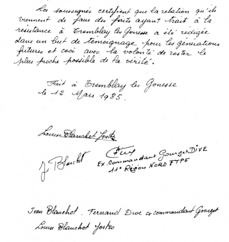 Le 27 août 1944, alerté par les Sartorio, Jean Blanchot s'est rendu à Villeparisis pour solliciter le secours du docteur Torraz, ami personnel de Fernand DIVE, mais celui-ci, effrayé par les combats en cours, n'a pas accepté de prendre le risque de se porter au chevet de son ami, nous relate le témoignage de Jean Blanchot.