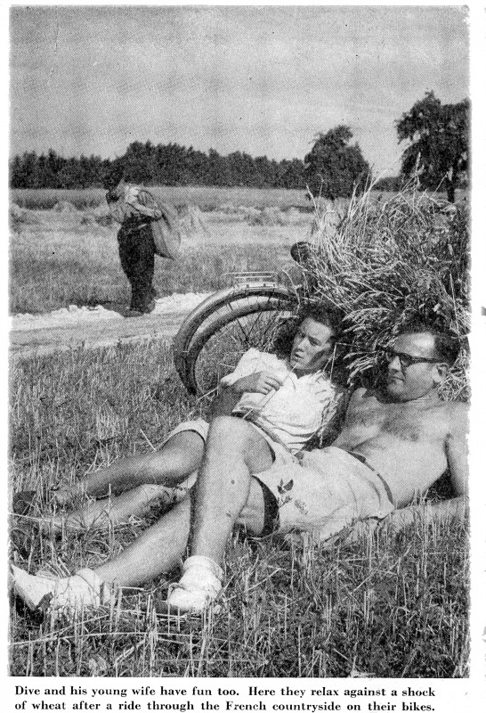- Page 27 à droite : " Dive et sa jeune épouse, se distraient aussi. Ici, ils se reposent contre un tas de paille après une promenade à bicyclette à travers la campagne française."