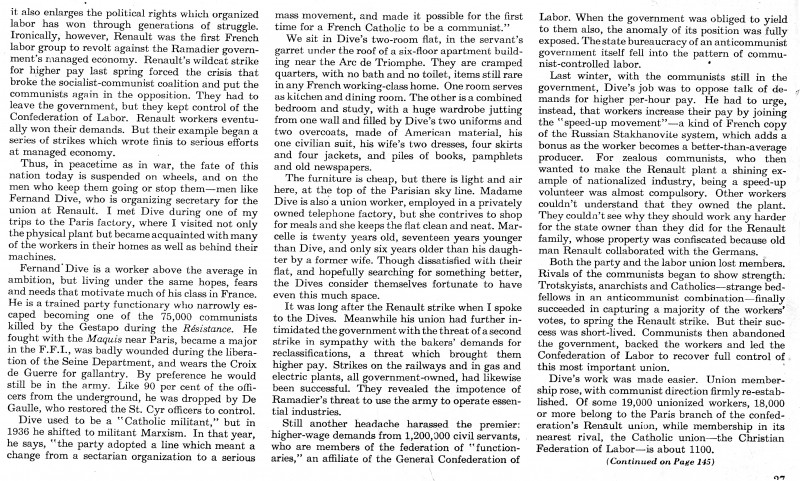 C'est longtemps après la grève de Renault que j'ai parlé aux Dive. Dans l'intervalle, son syndicat a encore intimidé le gouvernement avec la menace d'une seconde grève, en solidarité avec la demande d'augmentation des boulangers, une intimidation qui leur a procuré une paye plus élevée. Les grèves dans les chemins de fer et dans les usines de gaz et d'électricité, toutes appartenant au gouvernement, ont été de la même manière couronnées de succès. Elles ont révélé l'impuissance de la menace de Ramadier d’utiliser l'armée pour faire fonctionner les industries essentielles.
