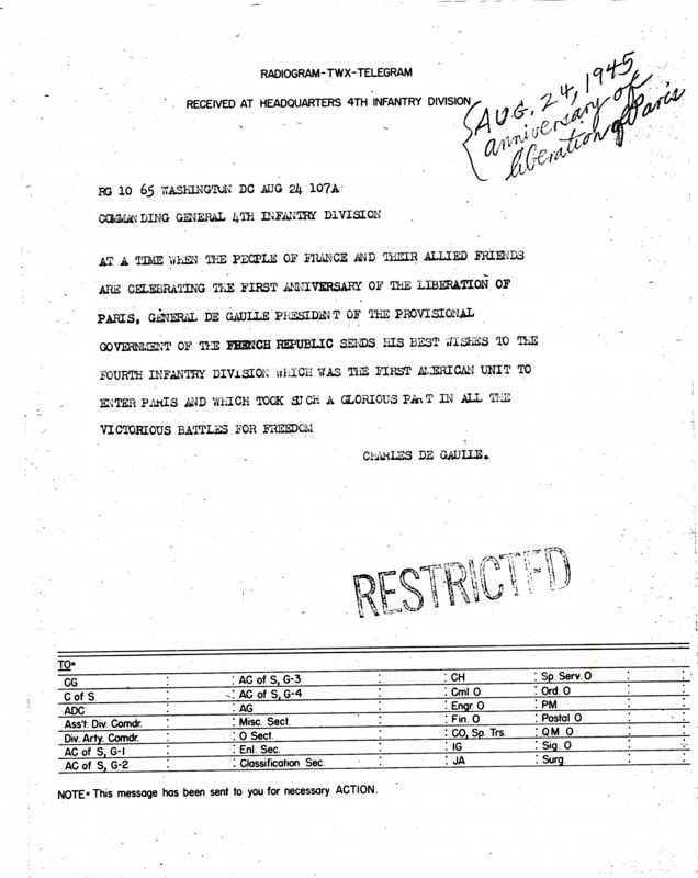 Les témoignages louant la valeur de la IVe Division et le rôle qu'elle a joué dans la libération de Paris et la banlieue sont multiples. Le plus illustre de ceux qui la félicitèrent est sans doute le général de Gaulle qui, dans un télégramme au général BARTON, le 24 août 1945, s'exprime ainsi: «Au moment où le peuple de France et ses amis alliés célèbrent le 1er anniversaire de la Libération de Paris, le général De Gaulle, président du gouvernement provisoire de la République Française, adresse ses vœux les meilleurs à la IVe Division qui fut la 1ère unité américaine à pénétrer dans Paris et qui prit une si glorieuse part dans toutes les batailles remportées pour la Liberté ». (8)