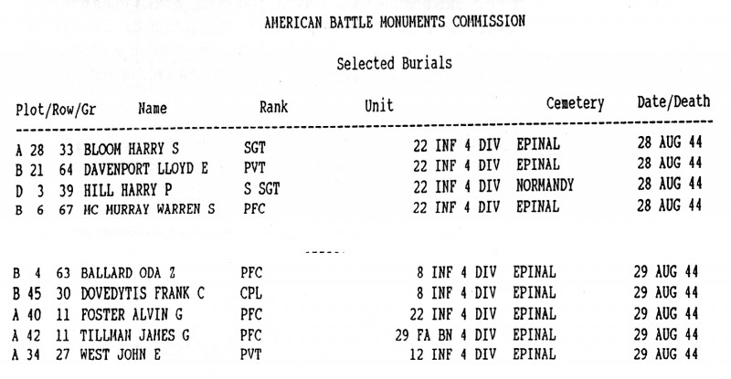LISTE DES SOLDATS DE LA IVème DIVISION AMERCAINE TUÉS AU COURS DES COMBATS POUR LA LIBÉRATION DE LA BANLIEUE NORD-EST, LES 27, 28 et 29 AOÜT 1944