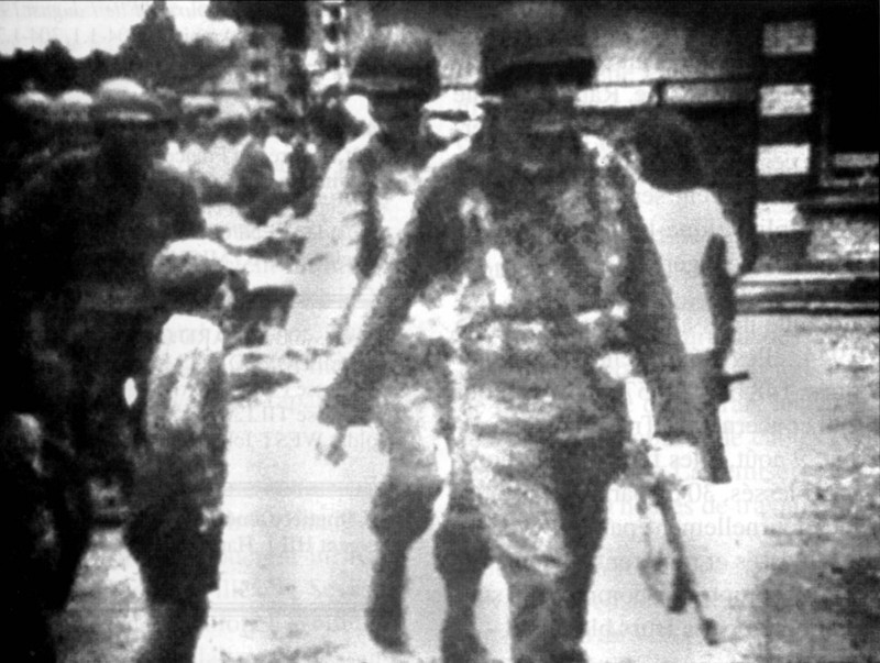 Une patrouille du 8ème régiment d’Infanterie de l’armée américaine, remonte l’avenue du commerce, dans le quartier du Bois-Saint-Denis. Les habitants se précipitent sur les Libérateurs et éprouvent le besoin de les toucher, comme on le voit sur l’image extraite du film tourné en 10 mm.