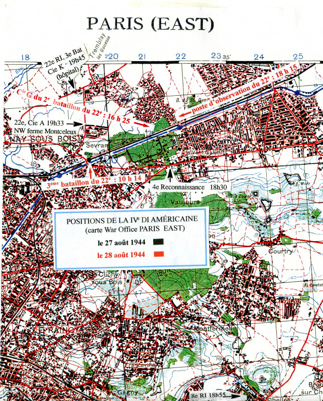 f. Le 22ème d’infanterie a nettoyé environ 14 000 yards (12,800 km) dans le secteur nord-est de la capitale de toute résistance allemande. Dans de nombreuses occasions le concours des FFI a été obtenu.