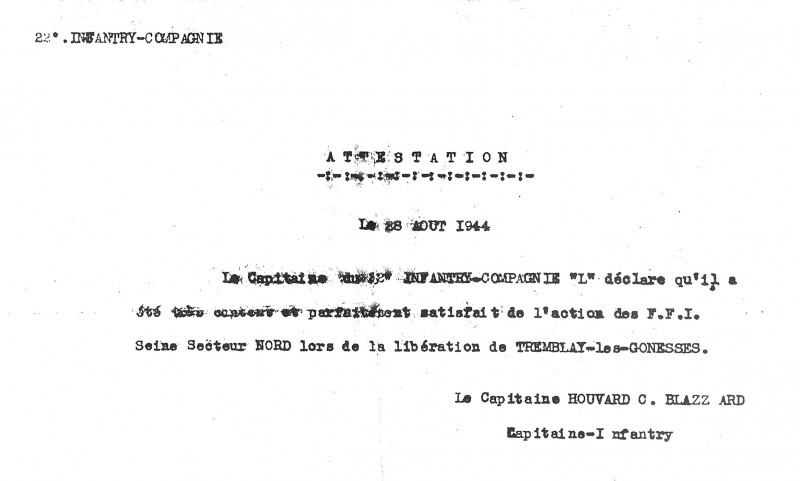 Attestation du captain HOUVARD C, 22th Infantry Regiment, Company L, Archives de la SEHT, fonds C Delpouve