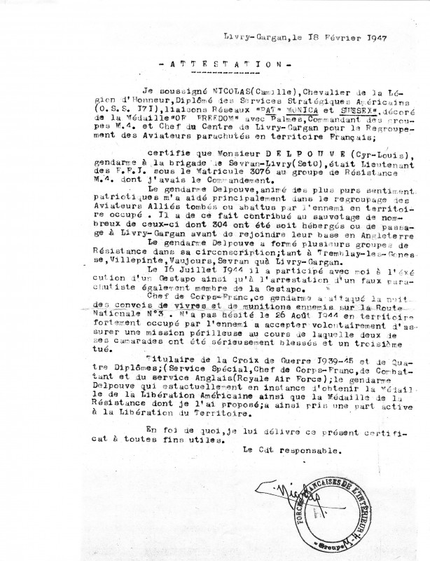 Au débarquement, lors des combats de Livry, le 26, je suis allé à Romainville avec le capitaine Rivalland qui commandait la section de gendarmerie du Raincy, renseigner les chars américains qui arrivaient sur la position allemande.