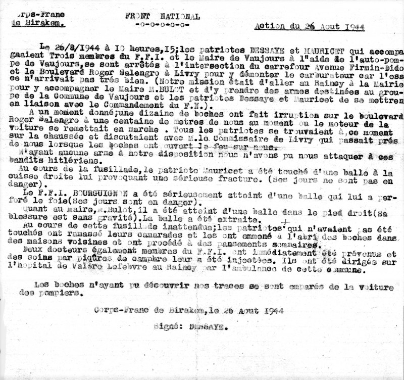 Compte rendu du résistant Delpouve, alias Dessaye, corps-franc Bir-Hakeim, front-national de la gendarmerie, 26 août 1944, archives de la SEHT, fonds Cyr Delpouve