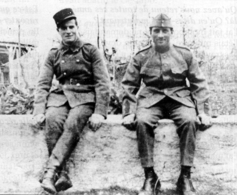 Maurice Decorzant, en uniforme de l’armée française, coiffé de son képi, pose aux côtés de l’un de ses frères, vêtu de l’uniforme de l’armée suisse. Né dans une famille franco-suisse, Maurice Decrozant avait opté à sa majorité pour la nationalité française, à la différence de ses frères qui ont choisi la nationalité suisse.