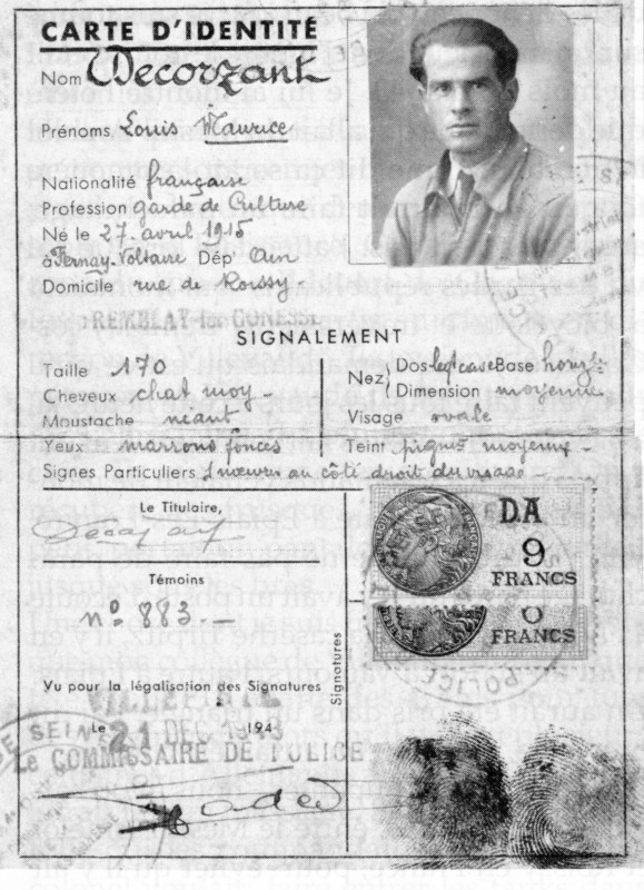Révoqué de la police nationale an titre des décrets vichystes de juillet et août 40 pour filiation étrangère, Maurice DECORZANT a été employé comme garde de culture à Tremblay pendant l'Occupation.