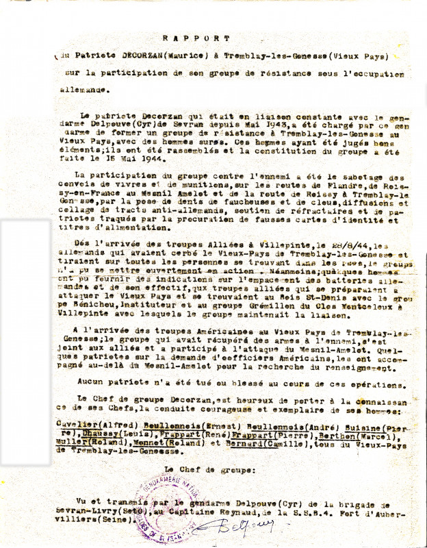 Nous donnerons l'intégralité du témoignage de Maurice Decorzant. Comme il s'exprime cinquante ans après les faits, sa mémoire marque quelques hésitations sur la composition exhaustive de son groupe. Comme nous disposons d'une copie carbonne du rapport qu'il a adressé, en septembre 1944, au gendarme Delpouve, nous citons en premier lieu lce document.