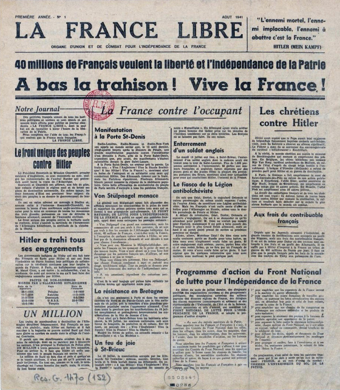 Les journaux clandestins de la Résistance : journal la France libre, août 1941, Gallica