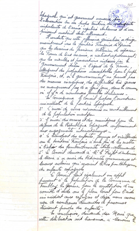 Après son élection au Conseil municipal, Gaston Beldame a assisté à huit séances, entre mai 1935 et octobre 1936. Pendant son séjour en Espagne, treize réunions du Conseil municipal se tiendront, de novembre 1936 à novembre 1938. Il sera porté absent, ou absent excusé, à chacune de ces séances. Après son retour, il participera à la réunion du 27 janvier 1939. En hommage à son engagement au service de la République espagnole, il sera désigné secrétaire de séance. Lorsque l’ordre du jour sera épuisé, le Conseil adoptera, hors séance, une motion de soutien à la République espagnole dont il est évidemment l’inspirateur. Elle dénonce l’intervention italo-allemande et propose cinq mesures de soutien : ouverture de la frontière avec l’Espagne, aide alimentaire, fourniture d’armements et munitions, accueil en France des enfants, femmes et vieillards victimes des bombardements, utilisation des locaux communaux disponibles pour l’hébergement des enfants espagnols. La motion s’achève par un appel pressant à la population locale pour la constitution d’un comité chargé d’organiser l’aide immédiate aux réfugiés.(7) L’engagement de Gaston Beldame au sein des brigades internationales n’est pas un fait isolé dans la commune. Le plus connu des engagements dans ces brigades est celui d’un antifasciste italien, Antonio Lamanteo (8).