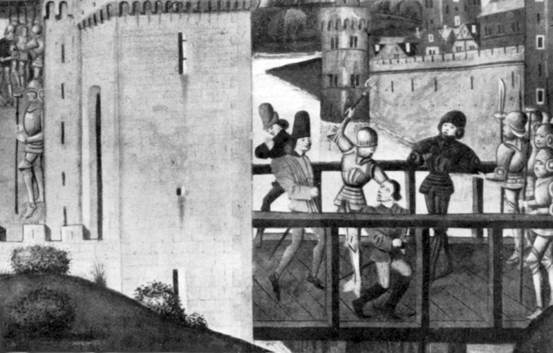 Miniature des Grandes Chroniques de France (milieu du XVème siècle). Gravure extraite de F. Lavisse, Histoire de France, tome quatrième 1, page 334. Sur le pont de Montereau, un homme d’armes assène un coup de hache sur la tête de Jean-sans-Peur.