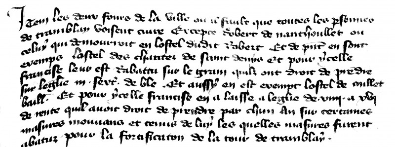 « Item les deux fours de la ville ou il fault que toutes les personnes de tramblay boisent outre excepté Robert de nanthouillet ou celuy qui demourroit en lostel du dit Robert et de present en sont exempts lostel des chantres de saint Denys et pour icelle franchise leur est rabattu sur le grain quilz ont droit de prendre sur leglise 3 septiers de blé et aussi en est exempt l’hôtel de milet baillet. Et pour cette franchise il a laissé à l’église de 14 à 16 sols de rente qu’il avait droit de prendre chaque année sur certaines masures mouvant et tenues de lui, lesquelles masures furent abattues pour la fortification de la tour de tramblay ».