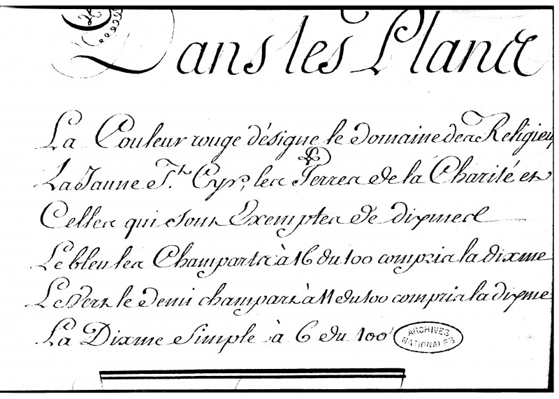 - jaune pour les terres d’église, exemptées du paiement de la dîme.