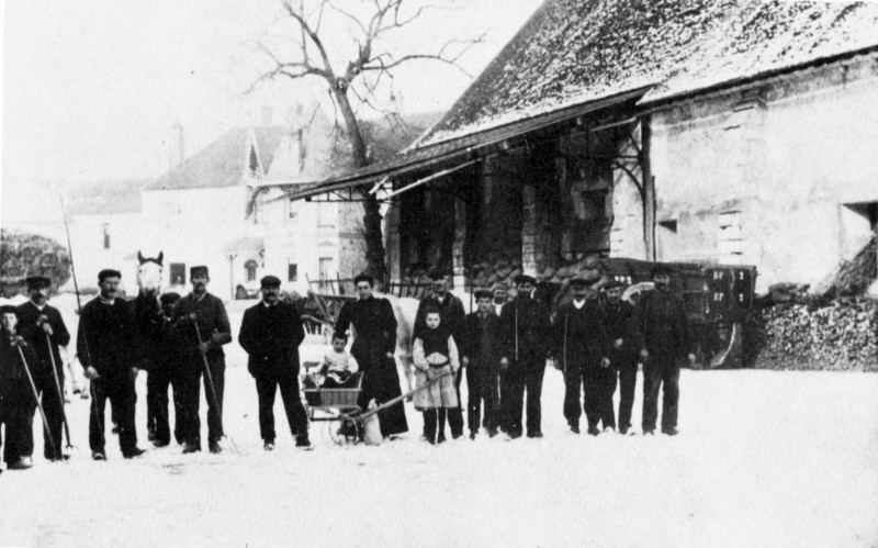 La cour enneigée de la ferme du Château vers 1908, archives de la SEHT, fonds Paul Dollé