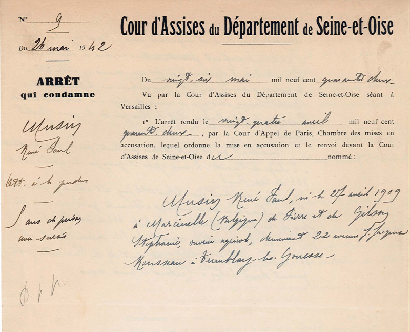 En-tête de la page une du jugement rendu le 26 mai 1942, à l’encontre de René, Paul Musin par la cour d'Assises du département de Seine-et-Oise.