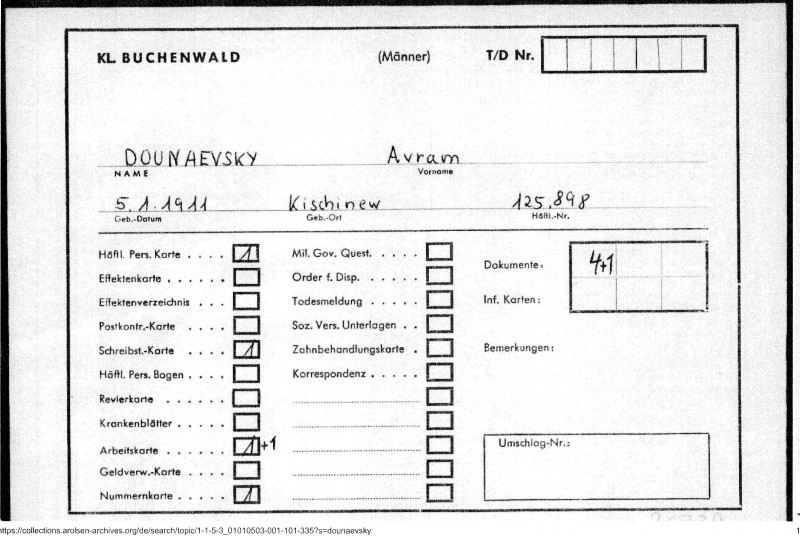 Une série de documents, sélectionnés par Brigitte et Sylvie DOUNAEVSKY, dans les archives de l’AROLSEN, permet de reconstituer le parcours d’Avram DOUNAEVSKY, homme de caractère qui a fait face avec courage à la barbarie nazie. Arrivé à Auschwitz, il est sélectionné pour les camps de travail. Il est recensé sous le numéro AU5564A qui le qualifie de déporté politique. Il sera tatoué du matricule 125 898 à Buchenwald.
