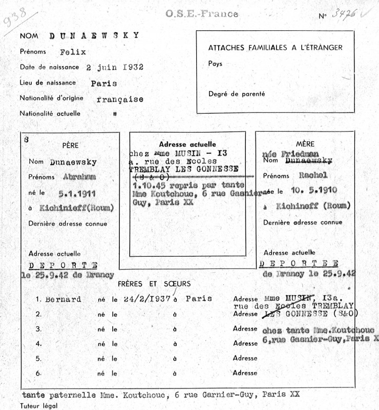 Bernard et Félix DOUNAEVSKY ont échappé à la déportation, parce qu’ils n’étaient pas présents au domicile des parents, lorsque ceux-ci ont été arrêtés, mais ils figurent sur la fiche de recensement de la famille, conservée aux archives de la police. Ils courent le risque d’être arrêtés, si la police parvient à les repérer.