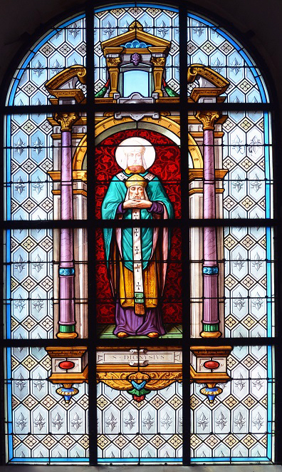 Le vitrail sud, qui représente saint DENIS, rappelle que Tremblay appartint, du IXème siècle à la Révolution, à l’abbaye de SAINT-DENIS. D’après GRÉGOIRE de TOURS, le saint fut évêque de Paris, vers 250. De nombreuses légendes entourent son souvenir. L’une d’elles, par confusion avec DENIS l’Aréopagite, fait de lui un contemporain des Apôtres qui aurait été converti par Saint-PAUL. La représentation du Saint décapité, tenant sa tête entre ses mains, donna naissance à une autre légende : après sa décapitation, le martyr se serait relevé pour prendre sa tête entre ses mains et se diriger vers le lieu qu’il avait choisi pour sépulture. La basilique édifiée en son honneur était située à Catuliacus, l’actuelle ville de Saint-Denis.