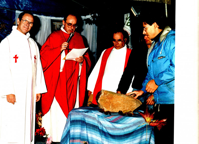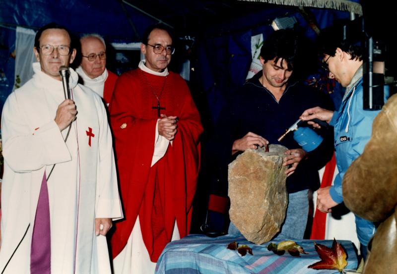Mgr Deroubaix bénit la pierre de Mauthausen, cliché archives de la paroisse Marcel-Callo