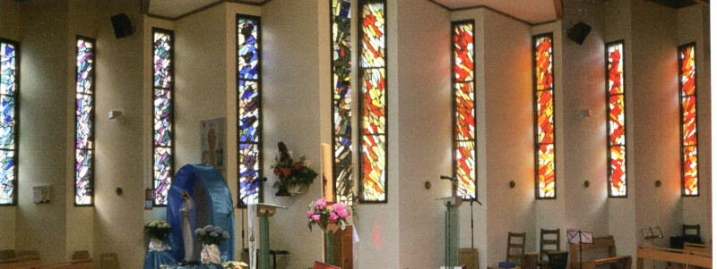 Sur les autres vitraux, l’artiste a disposé, sur des dalles de verre quadrangulaires, enchâssées dans un réseau de plomb, la répartition traditionnelle des couleurs en un dégradé bleu au nord, rouge au sud. Le recours à des dalles de même dimension et le dégradé des couleurs donne à cet ensemble une harmonie qui crée une ambiance, propice au recueillement.
