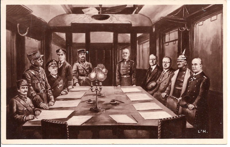 La 11 novembre 1918, à 6 heures du matin, les généraux allemands signent l'armistice avec les alliés près de la gare de Rethondes dans l'Oise. Dans le wagon-restaurant aménagé en salle de réunion, figurent de gauche à droite : le général Maxime Weygang, le maréchal Foch, l'amiral Rosslyn-Wemis, l'amiral George Hope, le capitaine Leperche, le capitaine von Heildorf, le comte von Oberndorff, Mathias Erzberger, le général von Winterfeld, le capitaine de vaisseau Vanselow.