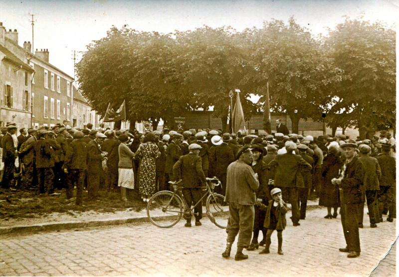 Arrivée des manifestants au Vieux-Pays et arrêt du cortège devant le café de la Mairie, pour une halte démocratique rafraîchissante, mai 1935, cliché René, Adolphe CHEVALIER.