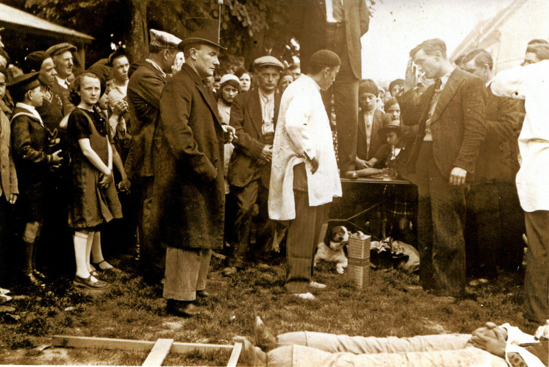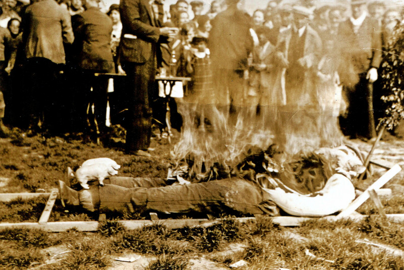 Mise à feu du mannequin, en compagnie des ses petits cochons. Bien que n’ayant exercé aucune fonction politique, ceux-ci ont été condamnés à partager le sort tragicomique de leur maître, mai 1935, cliché René, Adolphe CHEVALIER.
