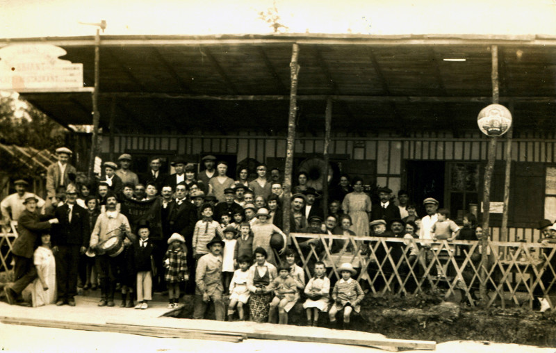 Acquis par le facteur BRIANT l’établissement rénové va accueillir la célébration des fêtes de la Commune libre. Cette carte postale témoigne du caractère festif du quartier avec ses convives attablés à l’extérieur devant le phonographe qui diffuse l’accompagnement musical des repas servis.