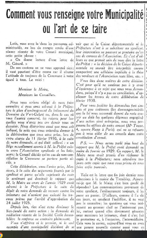 Comment vous renseigne votre Municipalité, ou l’art de se taire, bulletin de l’association syndicale, octobre 1931, © SEHT