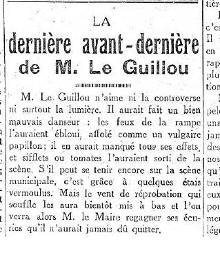 M. LE GUILLOU n’aime ni la controverse ni surtout la lumière. Il aurait fait un bien mauvais danseur : les feux de la rampe l’auraient ébloui, affolé comme un vulgaire papillon ; il en aurait manqué tous ses effets, et sifflets et tomates l’auraient sorti de la scène. S’il peut encore tenir sur la scène municipale, c’est grâce à quelques étais vermoulus. Mais le vent de la réprobation qui souffle les aura bientôt mis à bas et l’on verra alors M. Le Maire regagner ses écuries qu’il n’aurait jamais dû quitter.