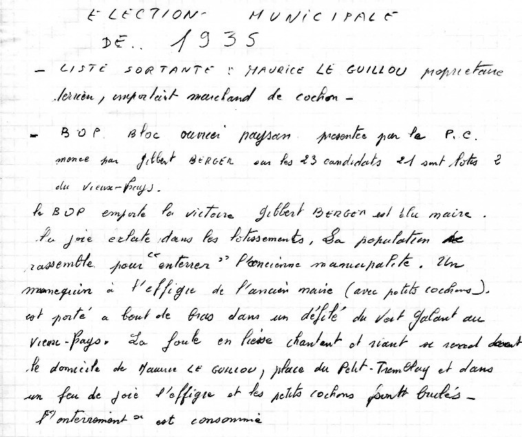 - BOP : Bloc Ouvrier Paysan présenté par le PC, menée par Gilbert BERGER. Sur les 23 candidats 21 sont des lotis, 2 sont du Vieux-Pays. Le BOP emporte la victoire, la joie éclate dans les lotissements. La population se rassemble pour « enterrer » l’ancienne municipalité. Un mannequin à l’effigie de l’ancien maire (avec petits cochons) est porté à bout de bras dans un défilé du Vert-Galant au Vieux-Pays. La foule en liesse chantant et riant se rend devant le domicile de Maurice LE GUILLOU, place du Petit-Tremblay et dans un feu de joie brûle l’effigie de l’ancien maire et ses petits cochons. L’enterrement est consommé