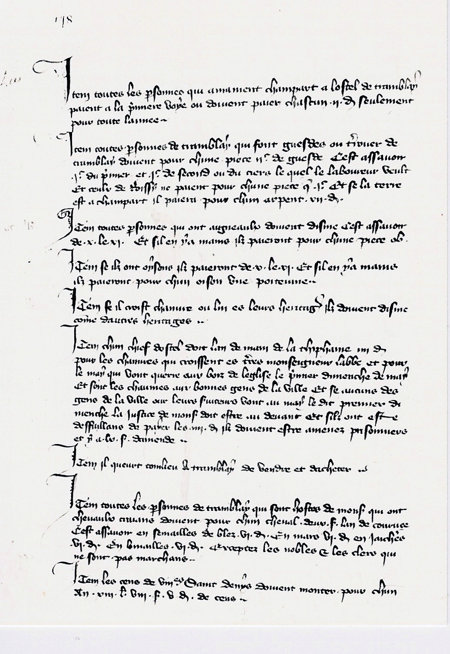 Transcription du folio 178 du cartulaire de l’abbé Philippe (Archives Nationales LL1209) Le cartulaire est transcrit ci-dessous mot à mot, avec respect de l’orthographe du document :Item toutes les personnes qui amennent champart à l’hostel de tramblay paient a la premières voye (au premier voyage) ou doivent paier chascun 2 deniers seulement pour toute l’annee Item toutes personnes de tramblay qui font guesde (qui cultivent du pastel) au terrier doivent pour chascune pièce deux cens de guesde (doublement du cens pour le pastel) c’est assavoir 2 cens du premier et 2 cens du second ou du tiers lequel le laboureur veult et ceulx de Roissy ne paient pour chascune piece qu’un sol et se la terre est a champart il paient pour chacun arpent 2 deniers. Item toutes personnes qui ont aigneaux doivent disme c’est assavoir de 10 le 11e et s’il y moins ils paient pour chacune pièce une obole.