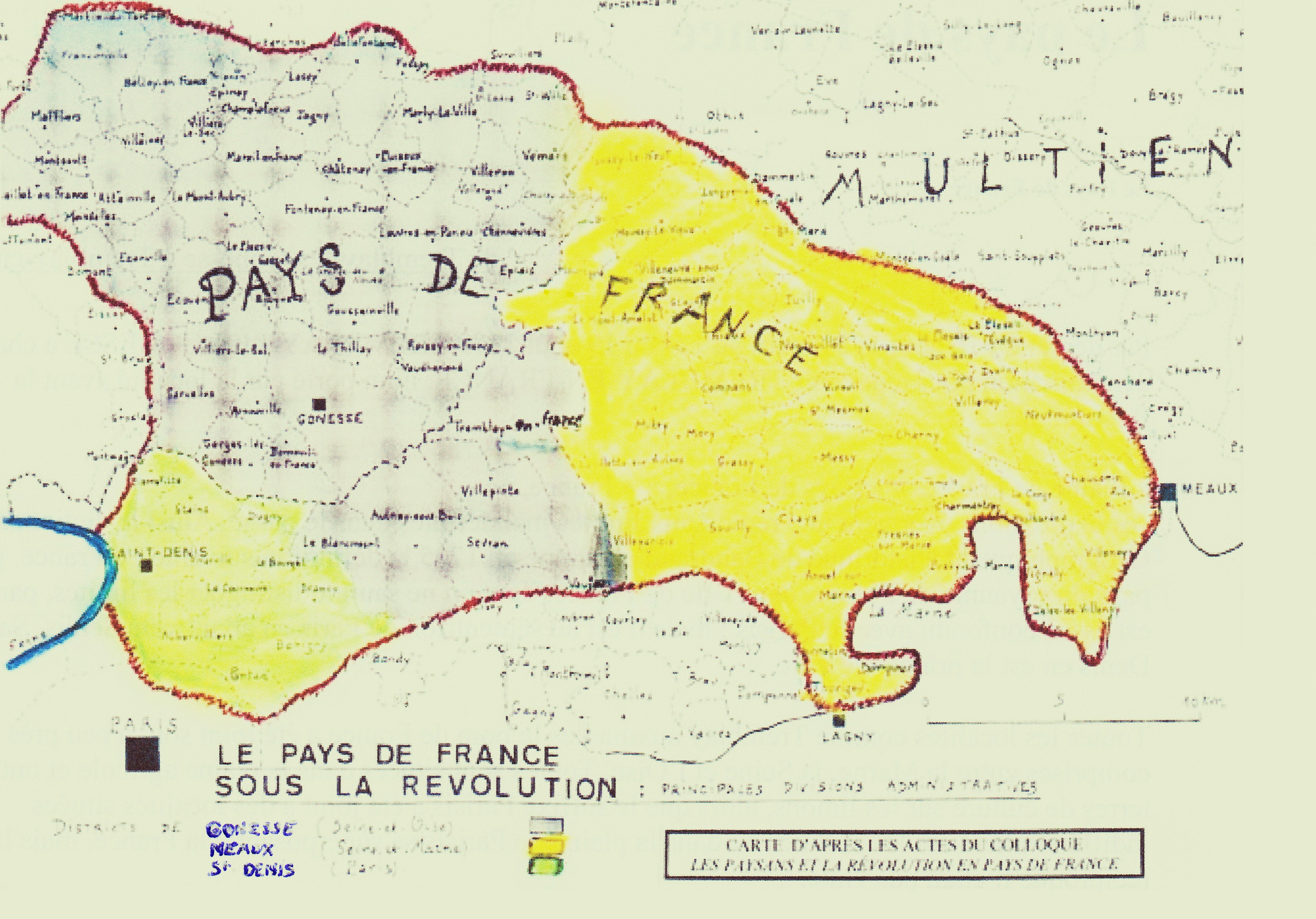 CARTE DES LOCALITÉS AYANT PORTÉ LE SUFFIXE FRANCE. Document extrait des actes du colloque des 15 & 16 OCTOBRE 1988 du Bicentenaire de la Révolution Françaiseen Pays de France. Bibliographie :