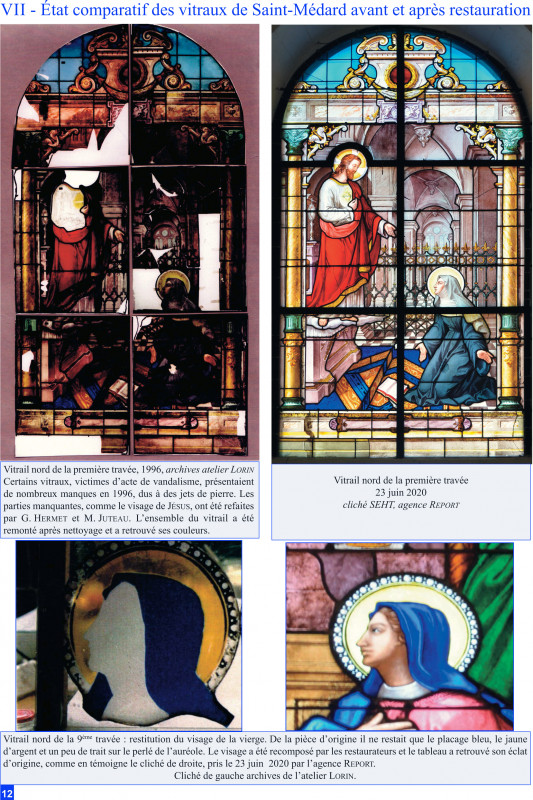 La restauration des vitraux de l’église Saint-Médard a été effectuée en 1996 et 1997, par Gérard HERMET et Mireille JUTEAU. Élodie VALLY, employée aux ateliers Lorin depuis 2004 a racheté l'entreprise en 2016 et choisi de poursuivre son histoire. Elle a réalisé cette acquisition en association avec François RATKOFF et Claire BABET. Depuis 2019, elle dirige seule les ateliers et emploie une équipe de trois collaborateurs choisis pour la qualité de leurs compétences techniques. Nous la remercions d’avoir accepté de recevoir la Société d’Études Historiques de Tremblay et de lui avoir ouvert les archives de la maison LORIN.