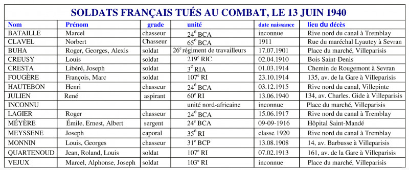 REMARQUE: Nous ne possédons pas de liste exhaustive des tués du 24e BCA. Trois corps restés sur place ont été identifiés lors de l'exhumation du 25.07.1940. Un autre, le sergent Méyère a été identifié à l'Hôpital de Saint-Mandé. Jusqu'au retrait du bataillon, les tués et blessés du 24' BCA ont été évacués sur le PC du bataillon situé à Vaujours. Le compte rendu du capitaine Gillot commandant la Première Compagnie du 24' BCA permet d'estimer à au moins 10 tués les pertes du bataillon; mais il ne donne pas de liste nominative des pertes de son unité.