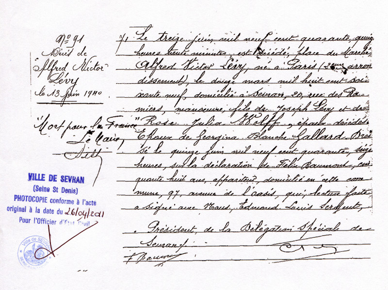 Agé de 71 ans, Alfed Victor Lévy habite à Sevran, 20, rue des Ramiers. Le 13 juin 1940, à 15 heures, il se trouve place du marché et est frappé à mort par un éclat d'obus.
