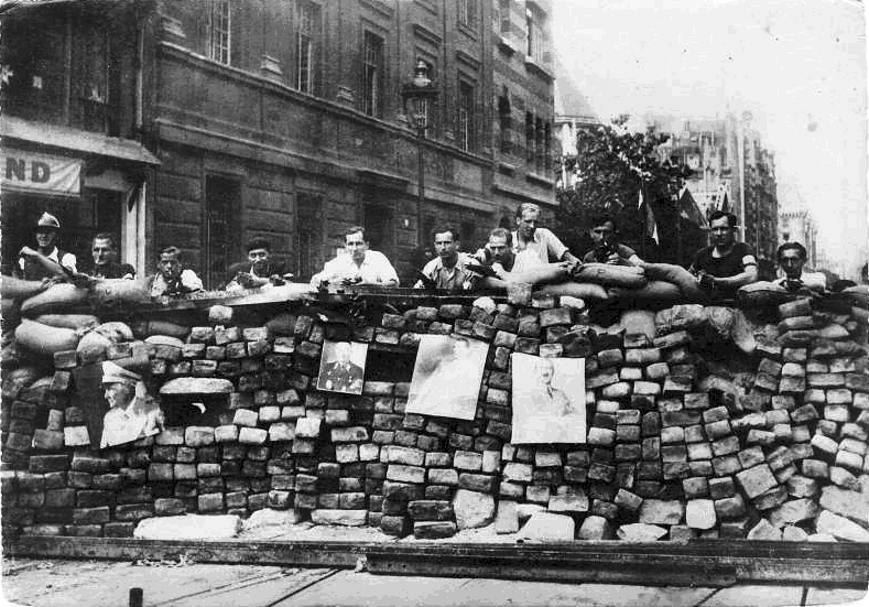- Le 19 août1944, la foule se rassemble sur le parvis de Notre-Dame, le drapeau tricolore est hissé sur les deux tours de la cathédrale. Les couleurs nationales flottent sur l'Hôtel de Ville et la Préfecture de Police. Des barricades sont dressées dans tous les quartiers.